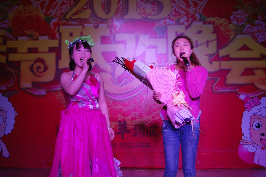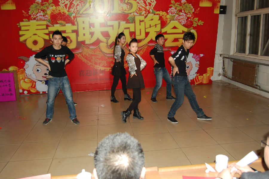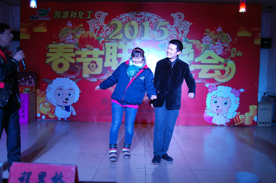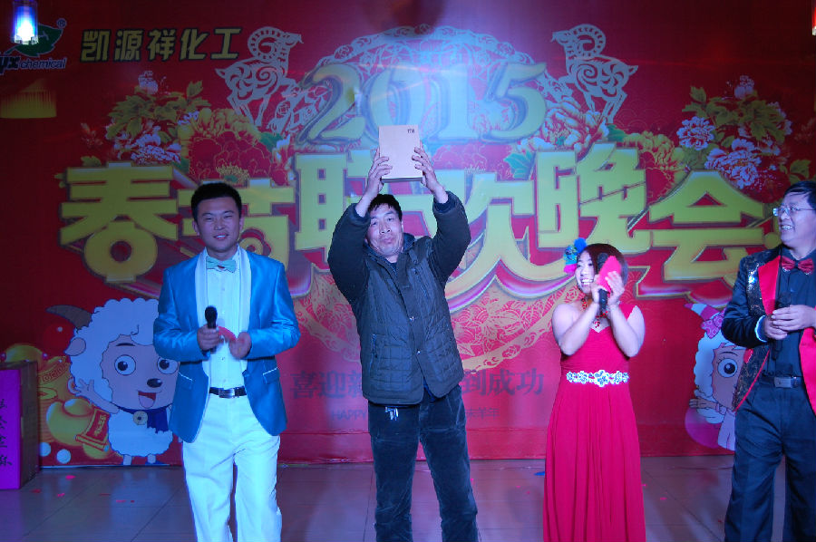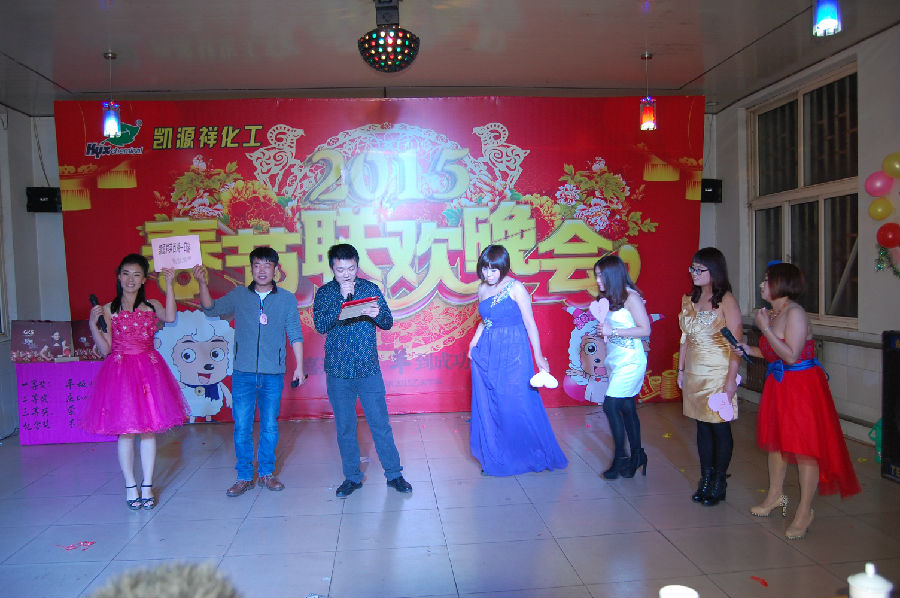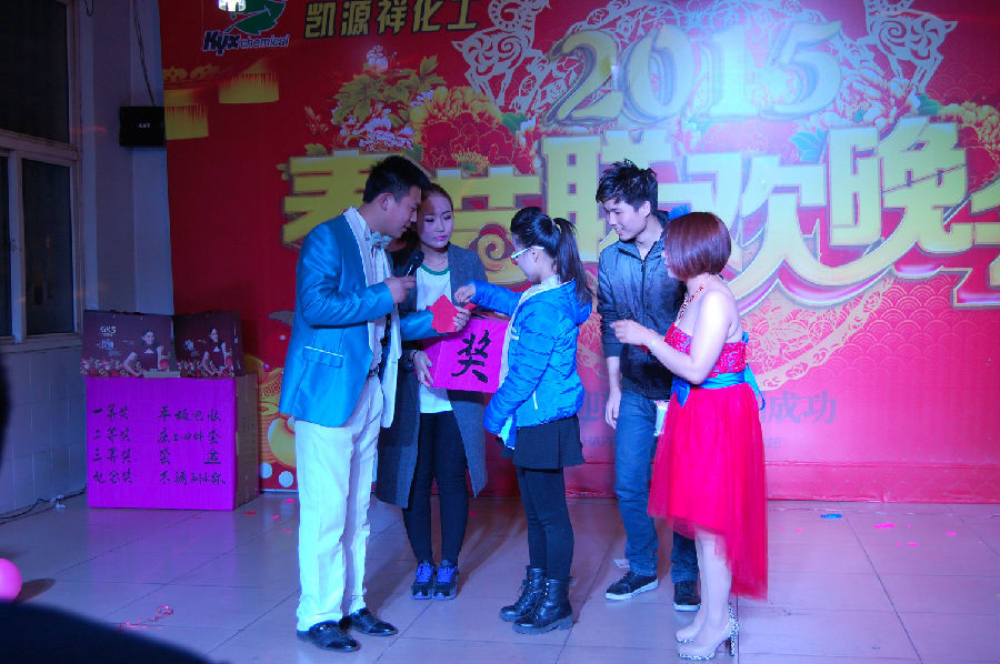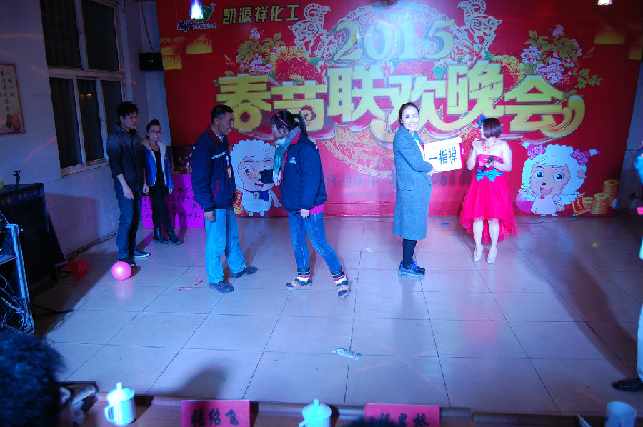 在一片歡聲笑語(yǔ)中凱源祥2015年春節聯(lián)歡晚會(huì )正式拉開(kāi)了帷幕,在一群青春靚麗的美女給我們帶來(lái)的開(kāi)場(chǎng)舞《歡天喜地》后,四名主持人入場(chǎng),介紹了本次晚會(huì )的相關(guān)流程及安排。本次節目共12個(gè),并穿插了3個(gè)小游戲(正話(huà)反做、你猜我劃、火眼金晴),及大家最期待的抽獎活動(dòng)4輪(幸運獎18名,三等獎9名,二等獎2名,一等獎1名),還有隨機的幸運觀(guān)眾30余名。