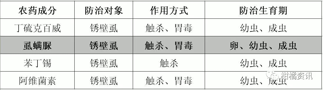 所以小編今日整理了一下關(guān)于防治銹壁虱的有關(guān)藥劑及作用方式